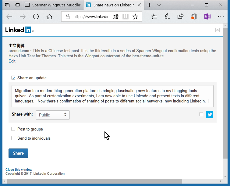 This is the fourteenth in a series of Spanner Wingnut unit-test confirmations. This post confirms the sharing of posts to LinkedIn, expanding sharing facility that is installed by default.