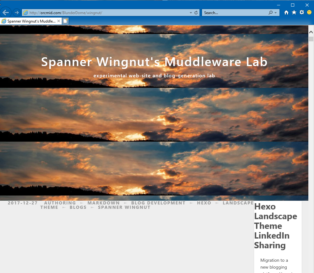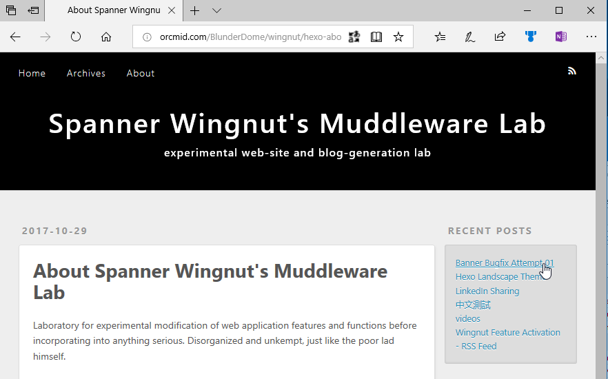 Migration to a new blogging platform, Hexo, is being worked out gradually. Experimental customizations of Hexo-generated blogging is at the Spanner Wingnut Muddleware Lab. Upon customization stability, other blogs are restored using simple variations.
