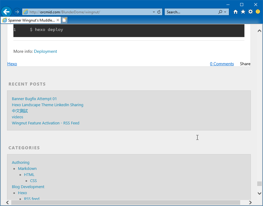 This is the twelfth in a series of Spanner Wingnut confirmation tests using the Hexo Unit Tests for Themes. This test is the Wingnut counterpart of the hexo-theme-unit-test videos.md post of 2013-12-25.