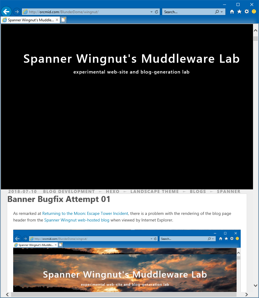 As remarked at Returning to the Moon: Escape Tower Incident, there is a problem with the rendering of the blog page header from the Spanner Wingnut web-hosted blog when viewed by Internet Explorer.
