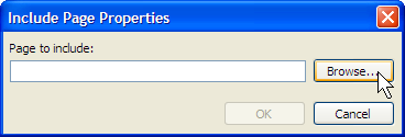 Fig. 1-5 Selecting the Page (typical)After the component and content type are selected, it is necessary to locate the page whose content provides the component (fig. 1-3). Browse to the page in the construction section of the site (fig. 1-4). When the page is located, its relative location will appear in the Include Page Properties dialog box (fig. 1-5). Accept the selection to have the table element appear in the location that is selected in the current HTML page's Design View.