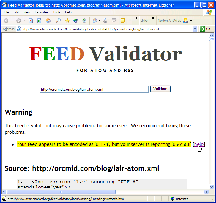 The Atom entry used to provide a corrected notice of lockdown for Orcmid's Lair exposes a problem with the encoding parameter of the XML preamble being in conflict with the hosted-site Content Type that is specified in serving up the Atom feed.