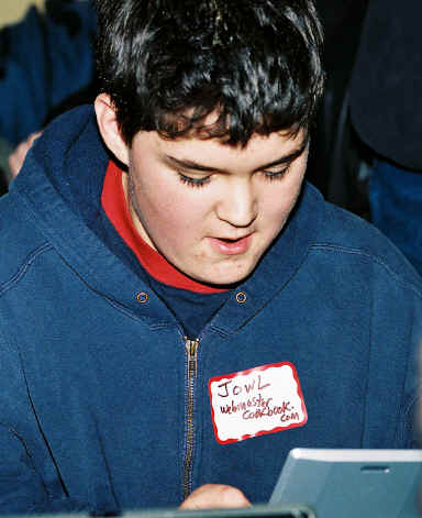 I am using a film camera, with a new electronic flash that I am still not accustomed to -- I think I need a diffuser so I can work closer, as I prefer. Naturally, I have also split across two rolls of film and the second is not processed yet. So there will be more pictures later. I think I have Jacqueline Passey, Jack, Ryan Anderson, Jeff, Jowl, Jon, and Chas coming up. This is film and every frame is an adventure, so we'll see. Jon has a nice collection of digital pictures up for viewing. [I've never looked up everyone's blog before. Jeepers. And I could have gotten tips from Matt May on making my sites accessible, one of my goals on 43 Things, and I'd love to know what life was like at NASA from Chas.] |
